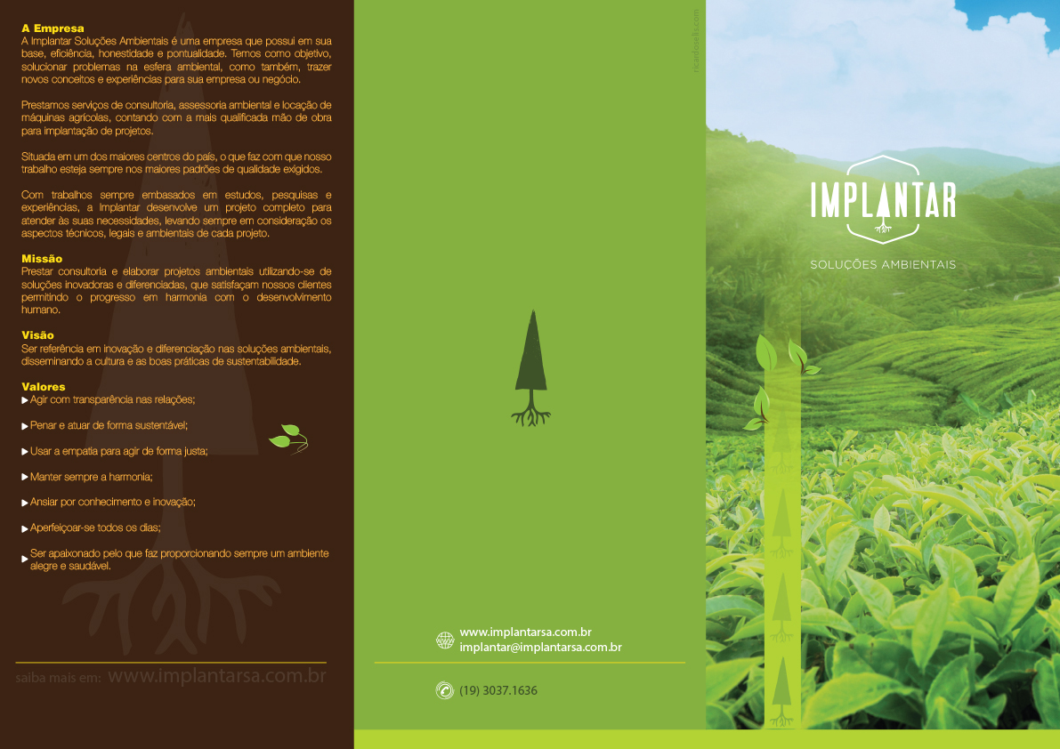 Criamos está peça de folder para empresa de soluções ambientais IMPLANTAR de Americana – SP. O objetivo era transmitir as informações de forma institucional de forma que utiliza-se um texto extenso com fotos, utilizando uma diagramação bem limpa. Resolvemos criando um folder de 03 dobras impressos no papel A3, o resultado ficou ótimo como pode conferir as laminas frete e verso abaixo:
