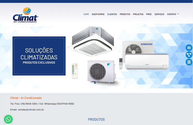 Também notará no site da Climat que implantamos o acesso flutuante para o WhatsApp que segue inserido nas páginas para prospecção e comunicação de contatos imediatos entre clientes e a empresa como também formulário de contato, área de currículo, menu fixo inteligente.